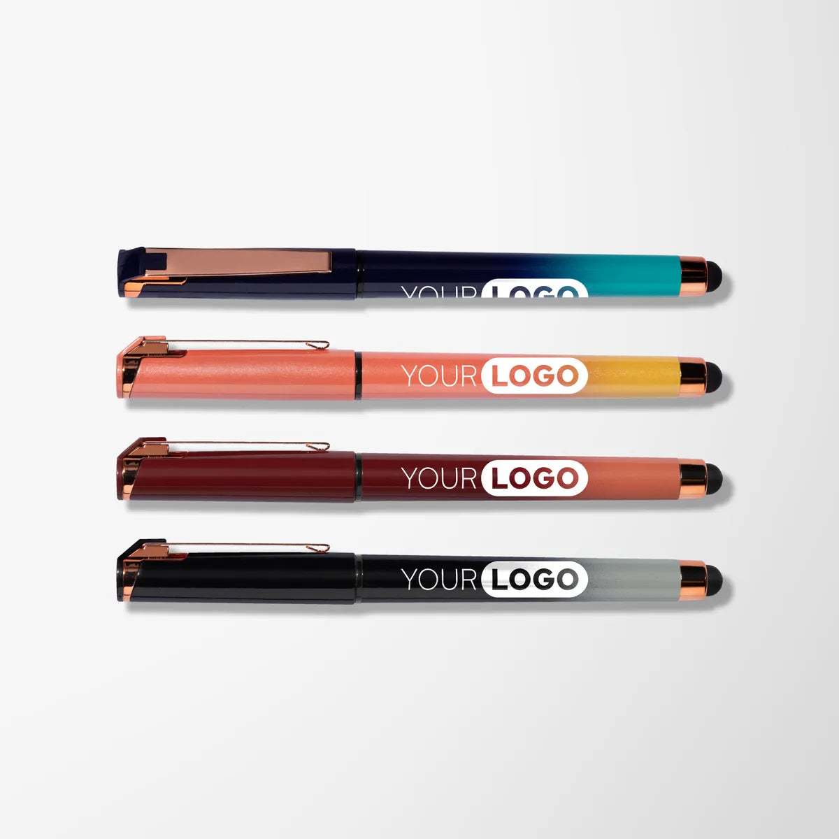 The rose gold trim, the ombré painted barrel, your custom logo...we can't decide what we love most about this pen! Equipped with smooth-writing gel ink, this personalized pen is a total standout. On one end of the pen, the cap features a convenient pocket clip—on the other, a built-in stylus adds even more functionality. Beneath the cap, a textured rubber grip makes for a comfortable writing experience.